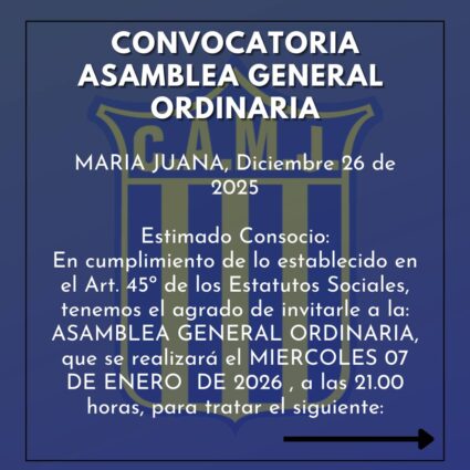 La institución de María Juana convoca a sus socios a participar de la Asamblea General Ordinaria, que se llevará a cabo el miércoles 7 de enero de 2026, a las 21.00 horas, conforme a lo establecido en el artículo 45° de los Estatutos Sociales.