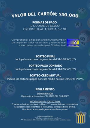 El valor del cartón es de $50.000, con la posibilidad de abonarlo en 10 cuotas de $5.000 o mediante Credimutual, con opciones de 1, 5 o 10 pagos. Además, quienes adquieran el bingo a través de Credimutual participarán en un sorteo extra exclusivo.
