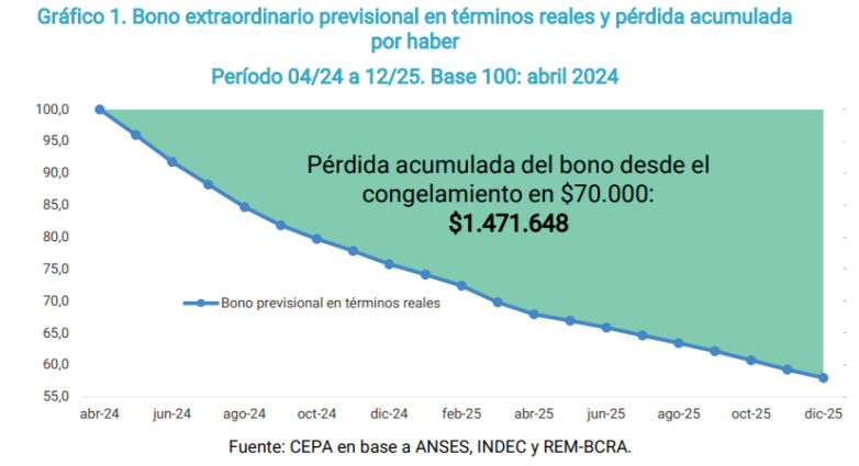 Uno de los puntos más críticos del escenario actual es el bono previsional de $70.000, que permanece congelado desde marzo de 2024. De haberse actualizado según la fórmula jubilatoria vigente, dicho refuerzo debería haber alcanzado los $177.482 en diciembre de 2025. Esta decisión generó una pérdida acumulada de $1.471.648 por jubilado entre abril de 2024 y diciembre de 2025.