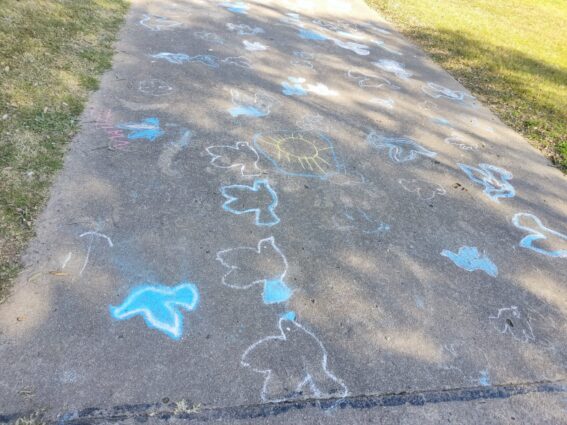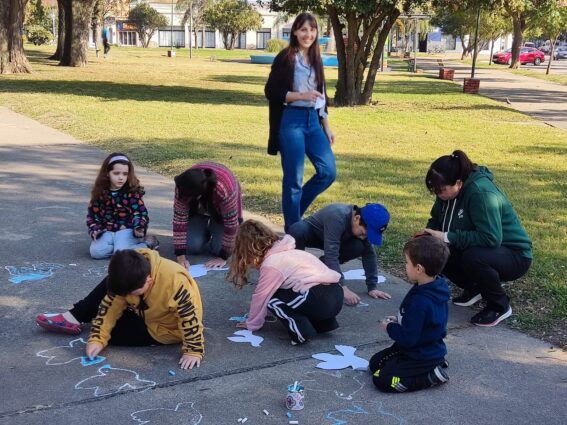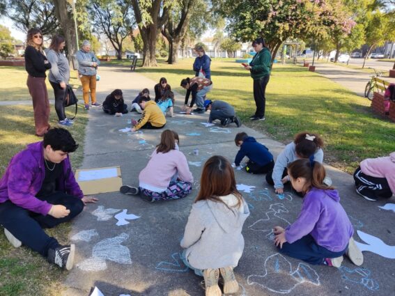Con tizas y stenciles provistos por la institución, grandes y chicos trabajaron en la creación de un camino de palomas blancas y celestes, representando los valores de libertad e independencia que dieron origen a nuestra Nación el 9 de julio de 1816.