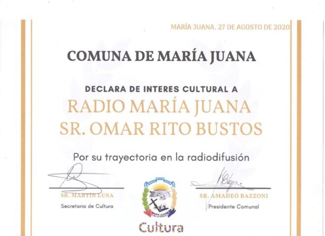 El 27 de agosto de 2020 se conmemoraron los 100 años de la primera emisión de radio en la República Argentina. Y esa fecha fue elegida por el Área de Cultura de la Comuna de María Juana para hacerle una mención especial a Omar Rito Bustos, quien fundara un 4Leer Más